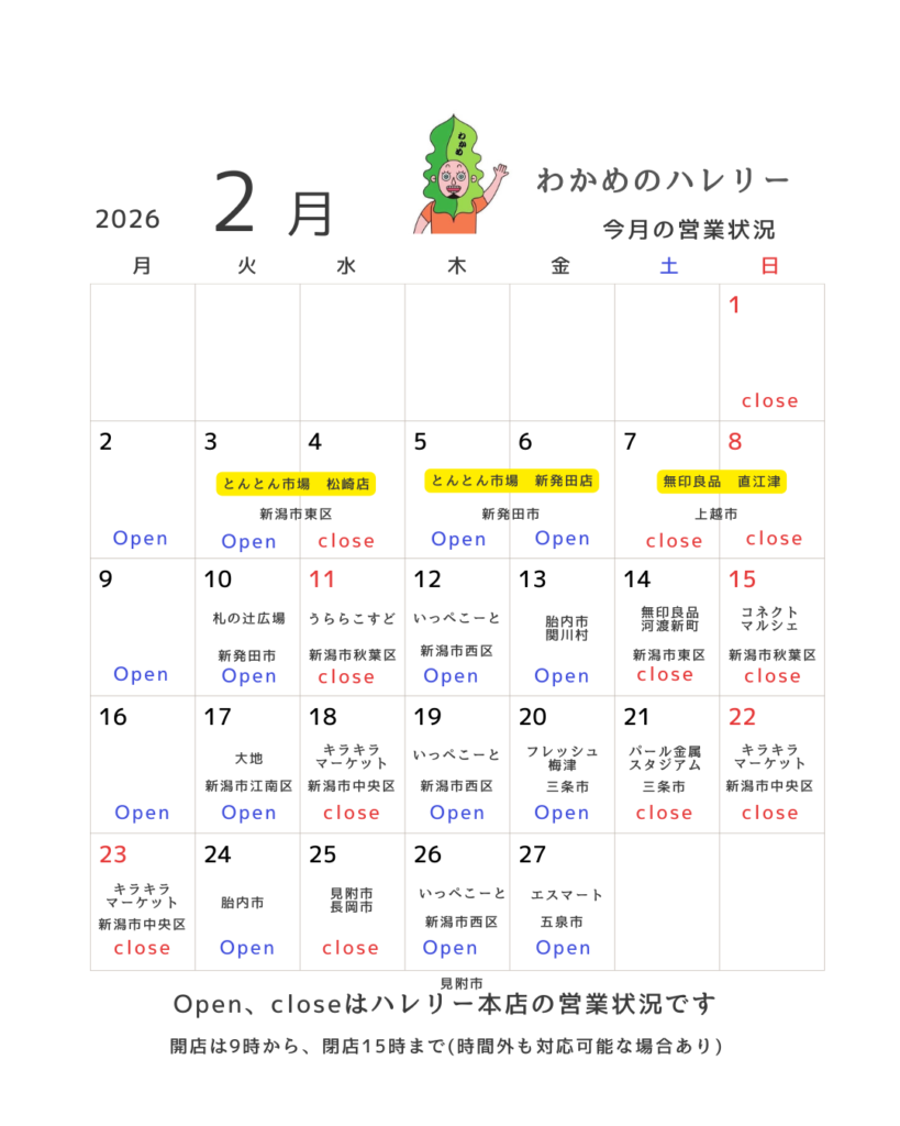 2月の店舗営業日、わかめ店長の対面販売の予定も載せましたのでご確認くださいませ!